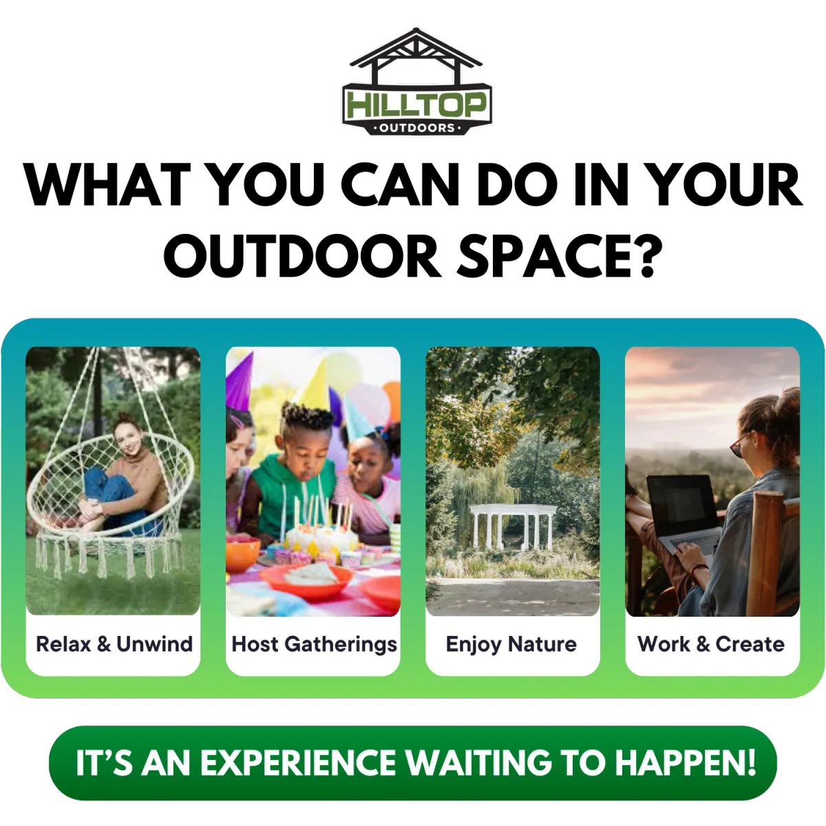 With the skilled craftmanship of Hilltop Outdoors, you can bring your vision of the perfect retreat to life. Take advantage of this exceprional offer to discover customized solutions that meet your unique needs and style.